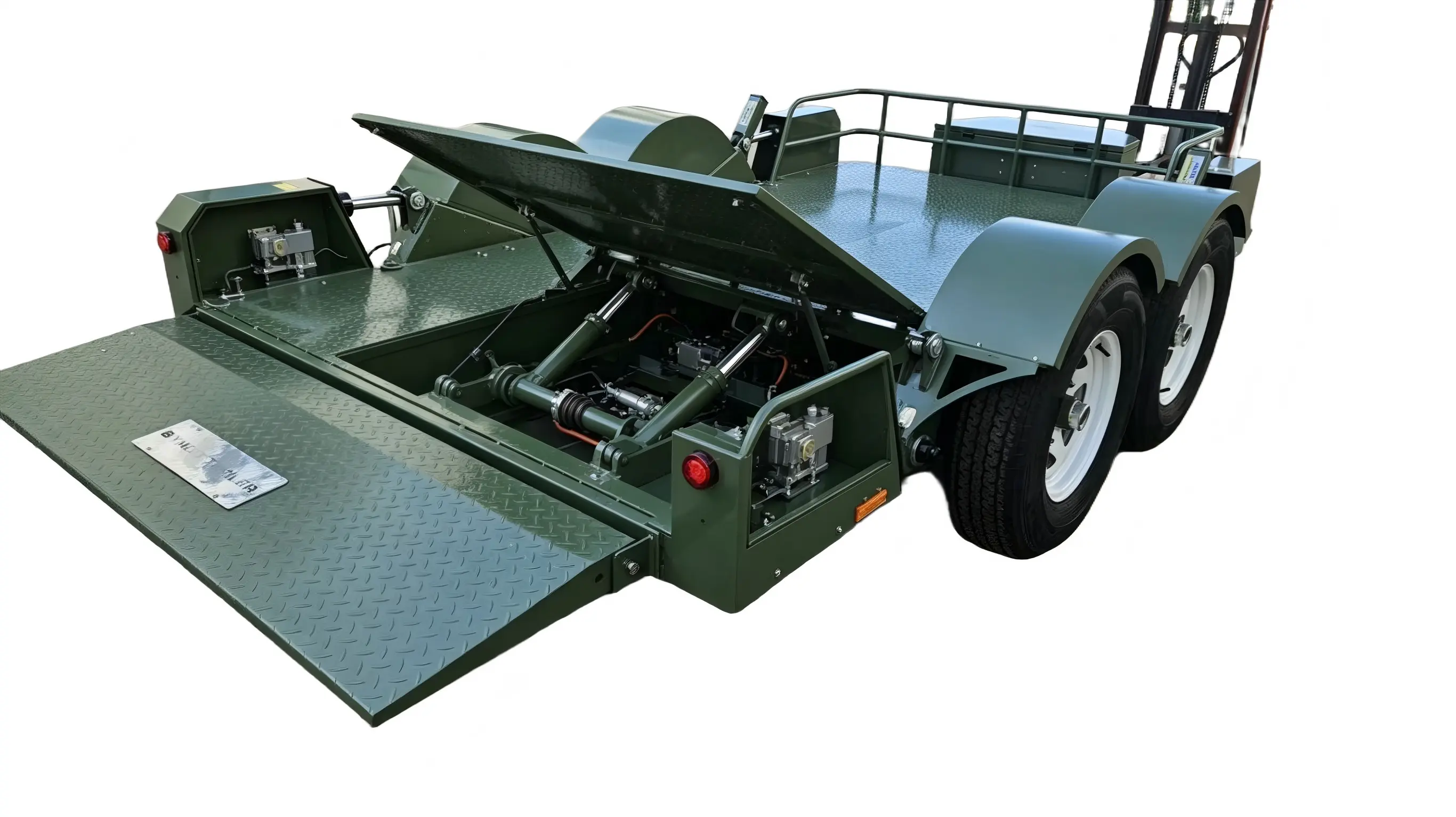 5トンデュアルアクスル油圧リフティングトレーラーは、中型および重量の機器、車両、資材の輸送用に特別に設計された頑丈なフラットベッドトレーラーです。安定した二軸シャーシと統合された油圧リフティング システムが統合されています。フォークリフトやはしごなどの補機が不要で、平台を地面近くまで降ろし、安定した昇降が可能で、自動積み降ろしを実現します。堅牢な全体構造、確実な積載量、簡単な操作性を備え、建設機械の移設、車両輸送、工場設備の取り扱い、農業機械の移送などに幅広く使用され、5トン重量物輸送の効率的かつ実用的な設備として機能します。